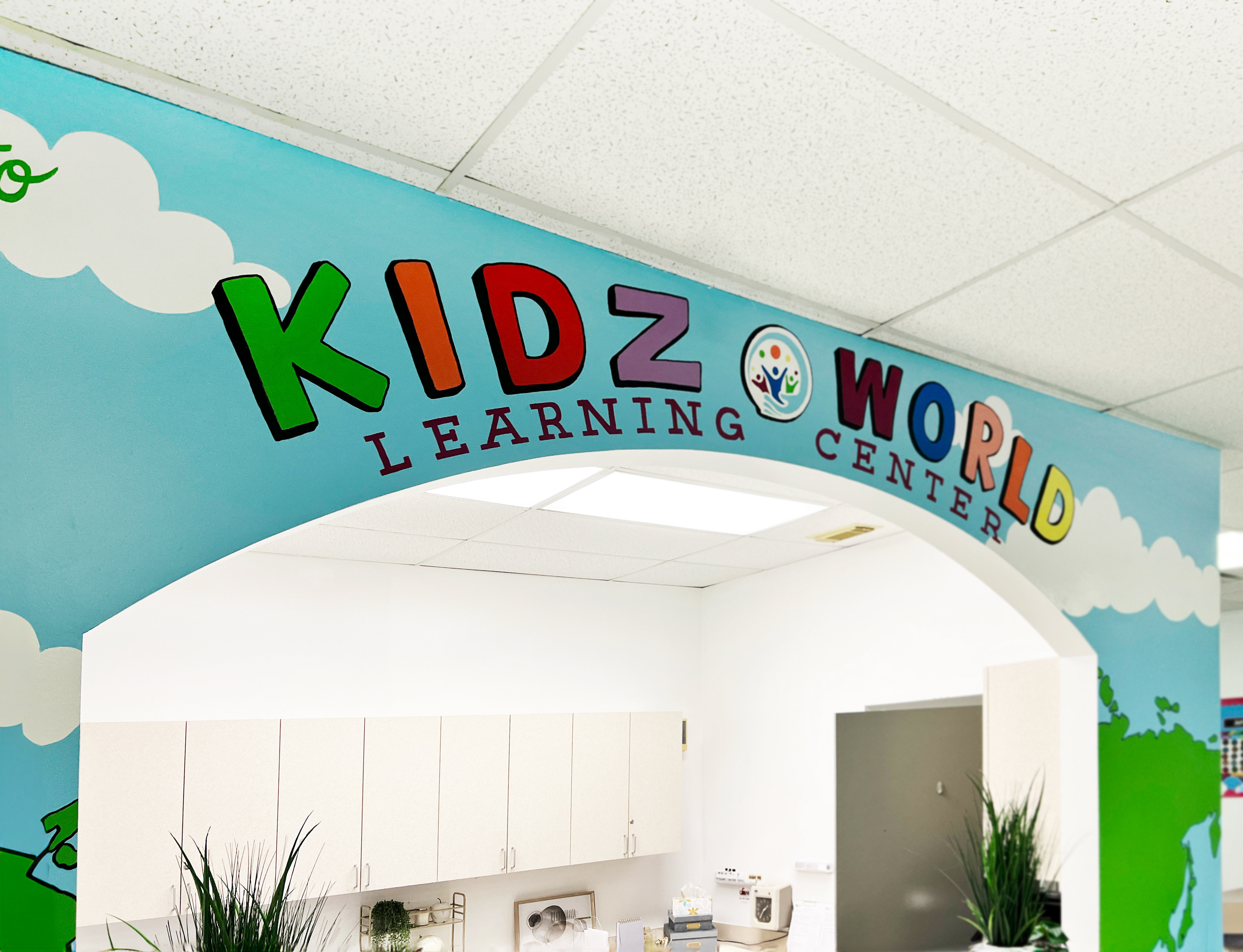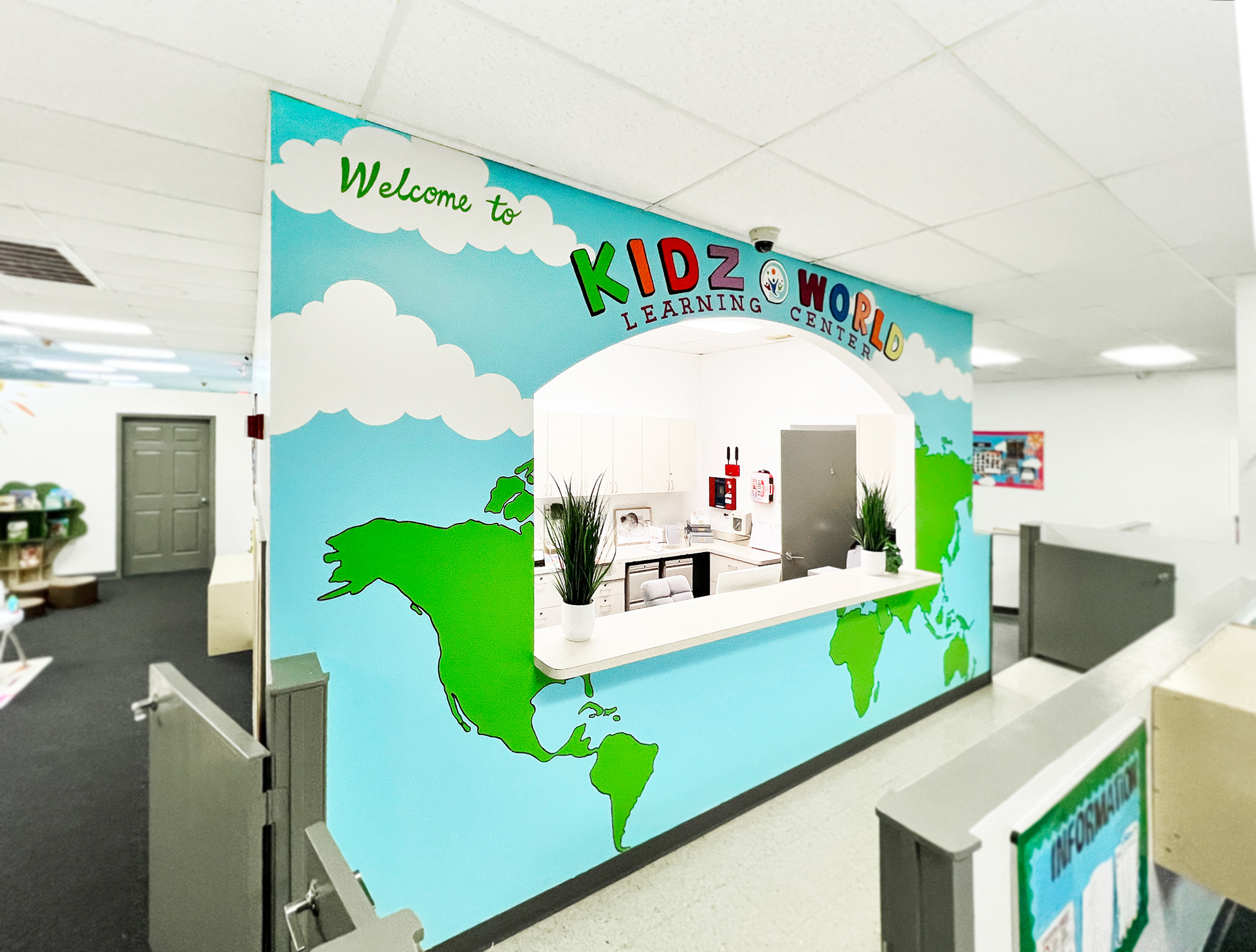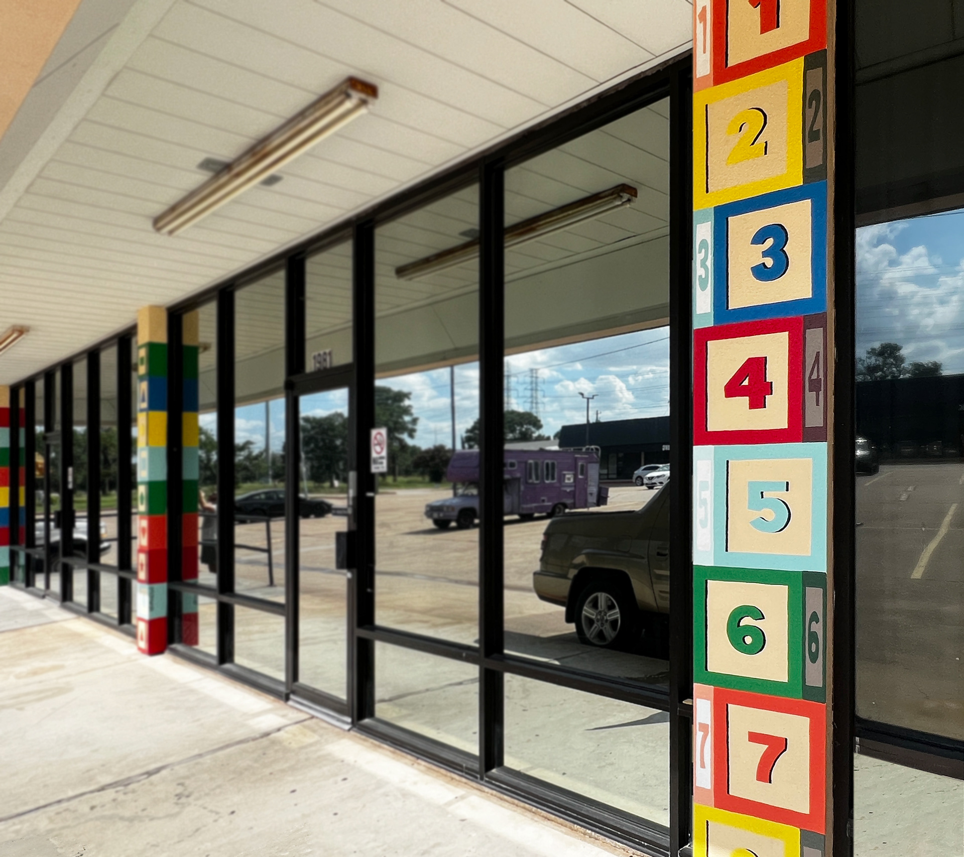 Concept: We incorporated the illusion of 3D children's blocks on the exterior columns and colorful hand-lettering and imagery on the interior entrance to add a more youthful and vibrant energy to this daycare.